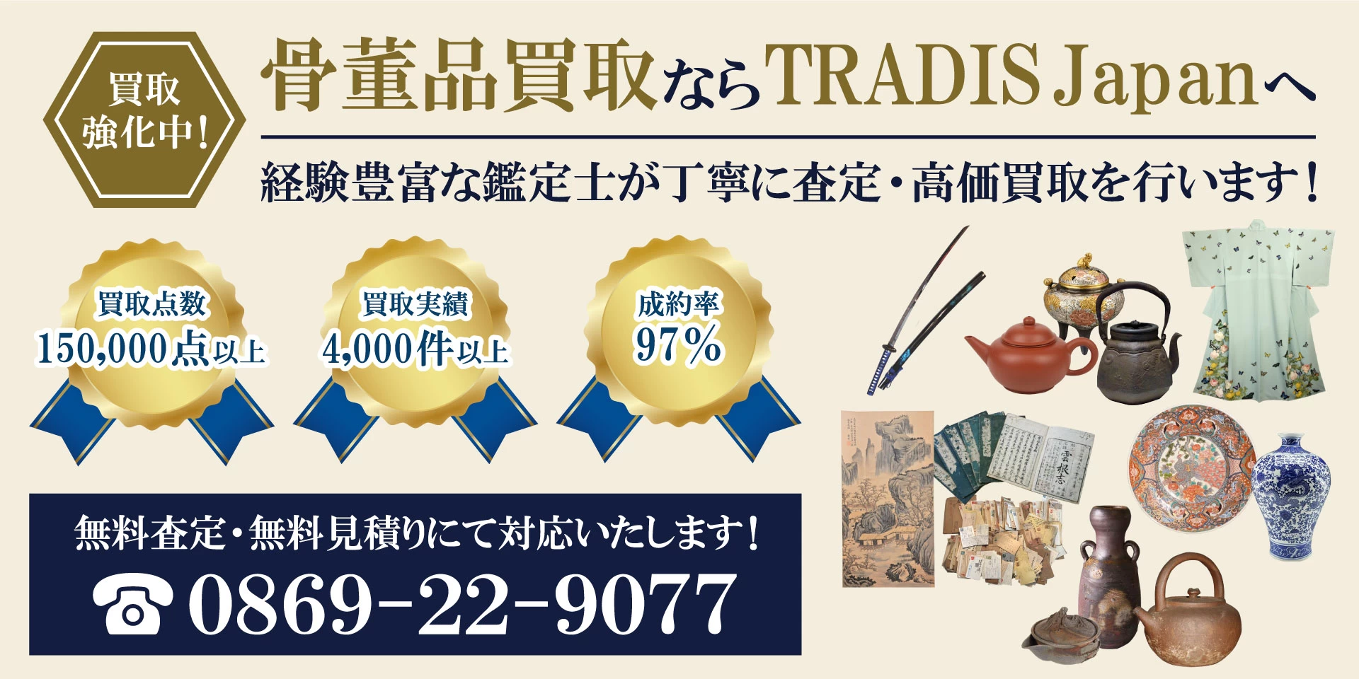 TRADIS Japanの骨董品買取事業では、豊富な経験と専門知識を持つ鑑定士が、お客様の大切な骨董品を丁寧に査定します。茶道具、備前焼、陶磁器、絵画、掛軸、刀剣・鍔、金・銀製品、着物、おもちゃ、軍隊物、オーディオなど、幅広い品目の高価買取を行っています。お客様の思い出や歴史が詰まった品物を次世代へと受け継ぐため、誠実で信頼性の高いサービスを提供しています。